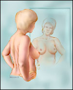 Begin by looking at your breasts in the mirror with your shoulders straight and your arms on your hips.