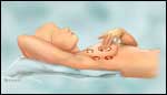 Next, feel your breasts while lying down, using your right hand to feel your left breast and then your left hand to feel your right breast. Use a firm, smooth touch with the first few fingers of your hand, keeping the fingers flat and together.