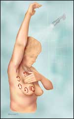 Follow a pattern to be sure that you cover the whole breast. You can begin at the nipple, moving in larger and larger circles until you reach the outer edge of the breast. You can also move your fingers up and down vertically, in rows, as if you were mowing a lawn. Be sure to feel all the breast tissue: just beneath your skin with a soft touch and down deeper with a firmer touch. Begin examining each area with a very soft touch, and then increase pressure so that you can feel the deeper tissue, down to your ribcage.