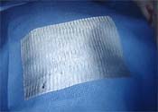 | This adhesion barrier looks and feels like a silky piece of gauze. | When placed over the uterus and sprinkled with sterile water, the adhesion barrier sticks to the uterus and prevents other organs from sticking to the sutured area. |